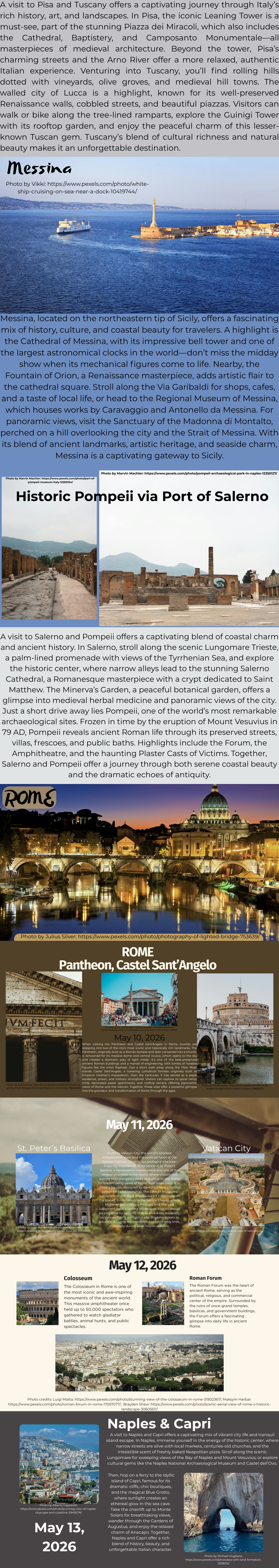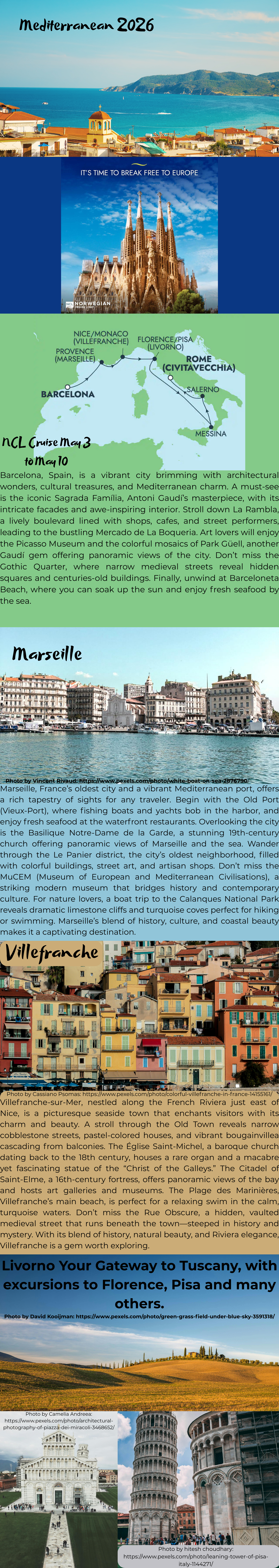 A celebratory vacation for our 30th wedding anniversary. A Norwegian Cruise Lines Mediterranean Cruise including Spain, France and Italy plus extra days in Italy to continue sightseeing. A family getaway we can't wait to experience in May 2026.