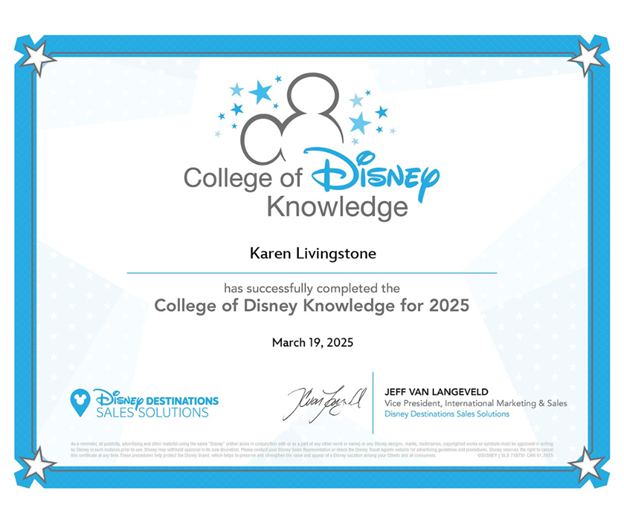 To enhance my expertise, I completed the College of Disney Knowledge—an official Disney training program designed specifically for travel advisors. Whether you're brand-new to Disney or a lifelong fan, this program dives deep into everything Disney has to offer, and it has given me even more tools to craft unforgettable vacations.