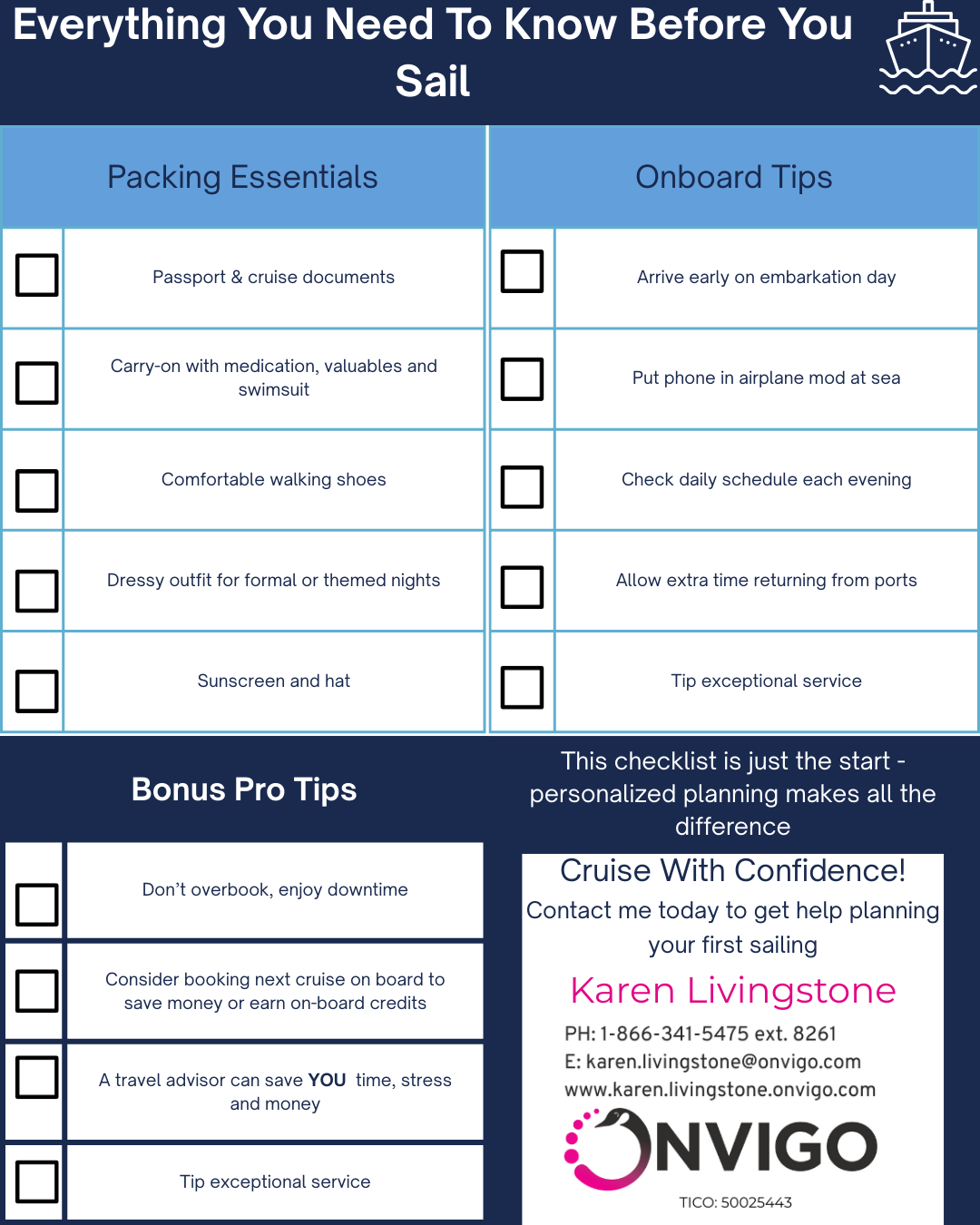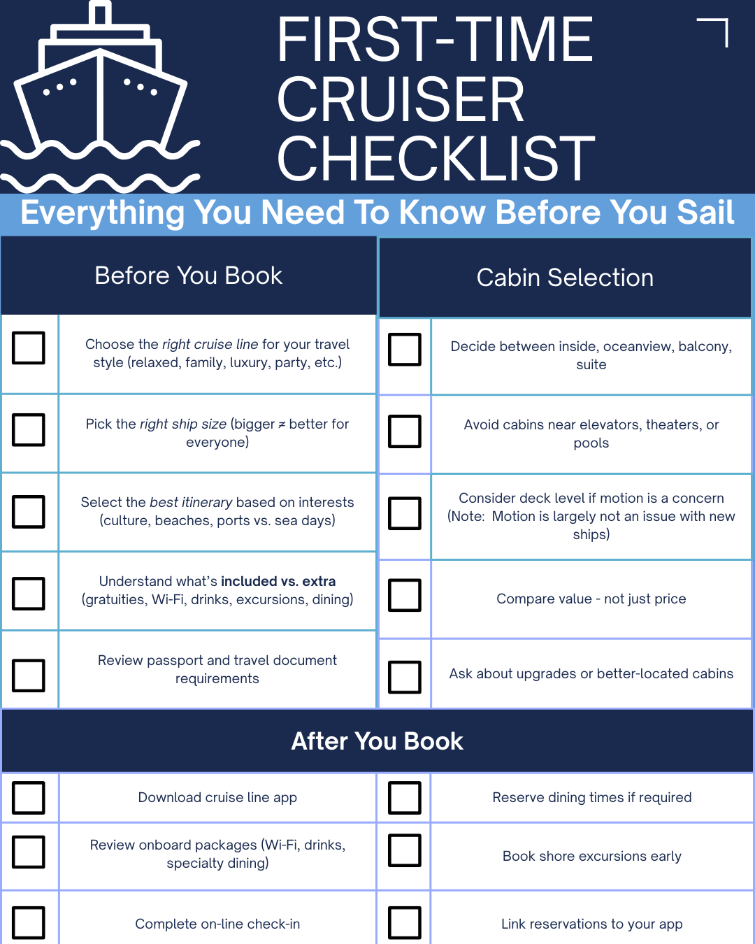 Cruise with Confidence with this checklist especially for first time cruisers or those considering their first cruise.