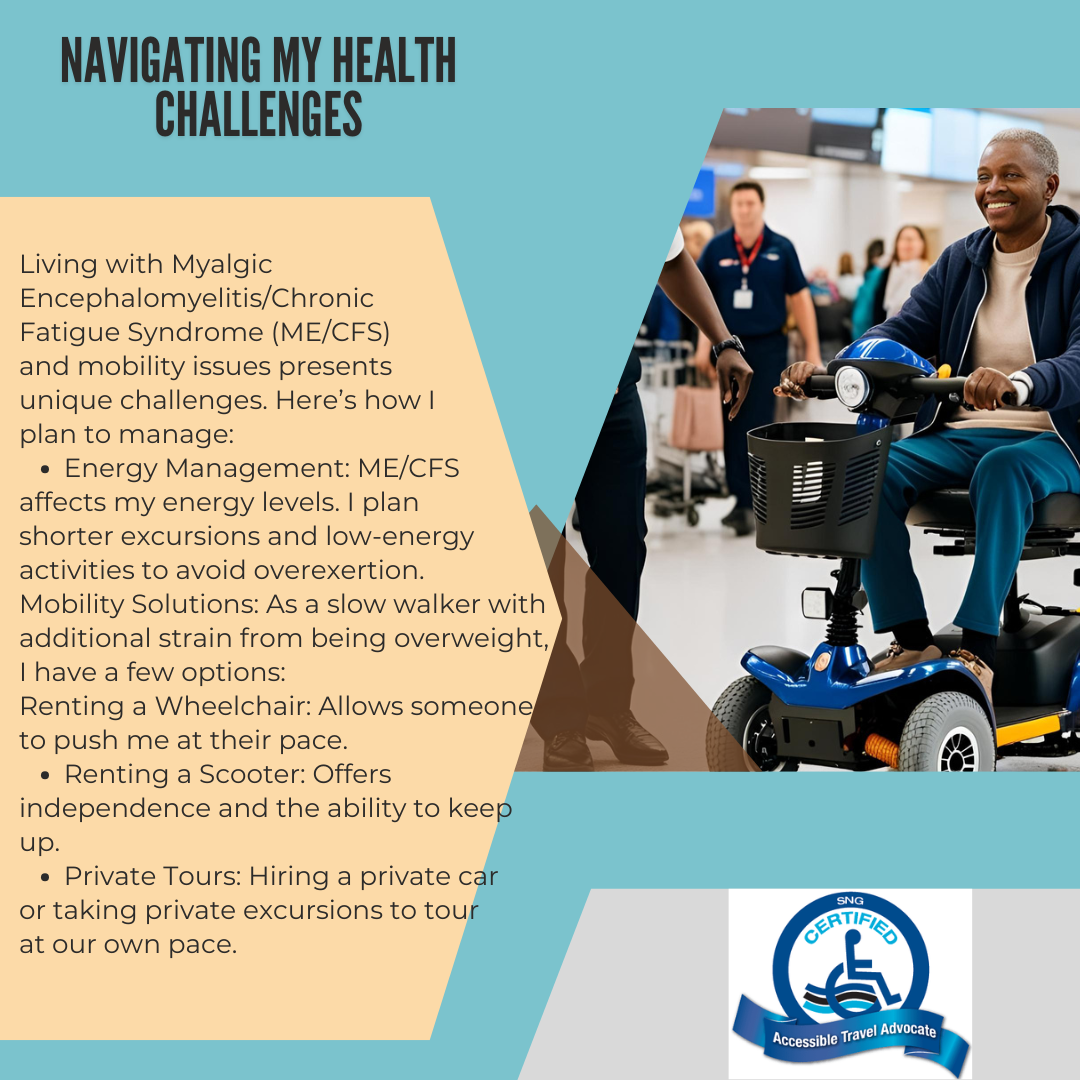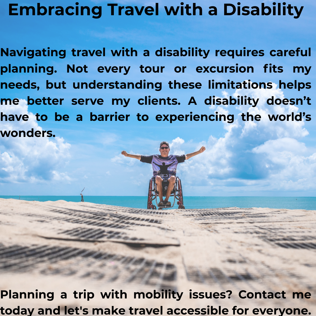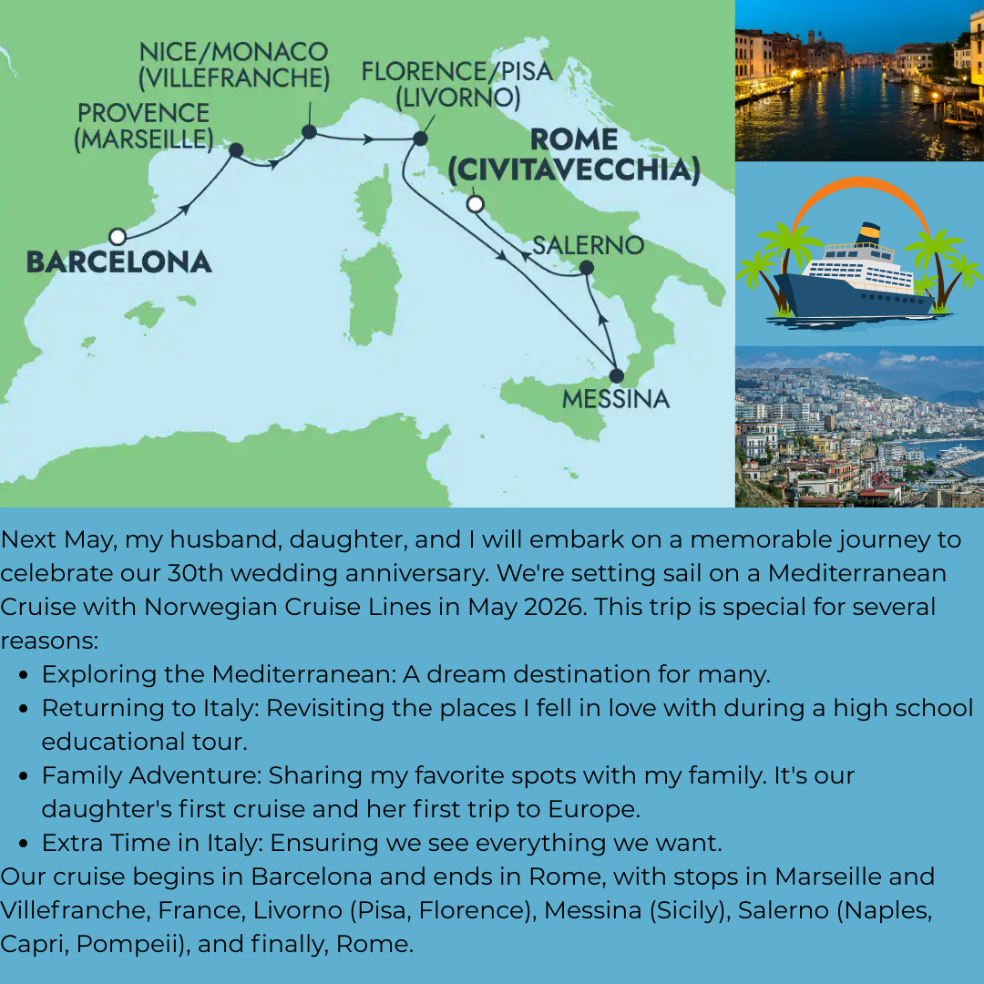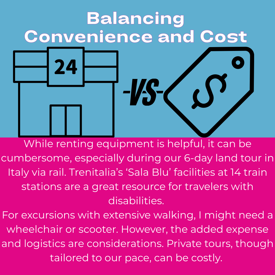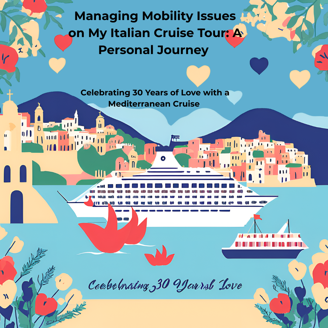 My personal story of a 30th wedding anniversary Mediterranean cruise through Italy, France, and Spain with with a disability. As an independent travel advisor living with ME/CFS and mobility challenges, I examine practical options for accessible travel, including wheelchair and scooter rentals, energy management strategies, and using services like Trenitalia’s Sala Blu. This personal journey blends travel planning, family bonding, and disability advocacy, offering valuable insights for travelers navigating Europe with mobility issues.
